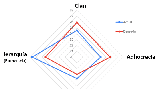 De acuerdo a los resultados obtenidos de las entrevistas y las encuestas, se estableció que el modelo de Cultura Organizacional y Liderazgo predominante en nuestra municipalidad es del tipo “Jerárquica”, con un alto énfasis en la burocracia, la estabilidad y el control; tal como se observa en el siguiente gráfico: