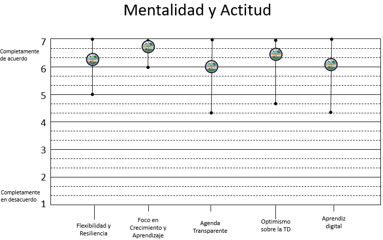 3. El optimismo que existe sobre la transformación digital, así como también el foco en el crecimiento y aprendizaje sobre la mentalidad reflejan que existe una mentalidad y esfuerzos propositivos sobre la TD. Por lo tanto, es importante que se fortalezca el intercambio de información acerca de conocimientos y usos de las herramientas digitales.