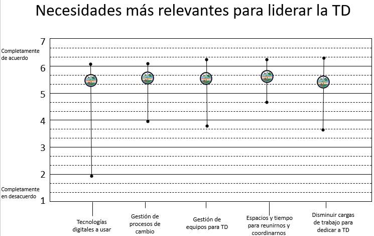 2. Lograr una buena implementación de la TD se relaciona directamente con la toma de decisiones basada en datos, reflejando la búsqueda por incrementar la eficiencia y calidad del trabajo realizado. Es importante notar que la alfabetización digital y la administración personal continúa siendo una preocupación, por lo que es vital que se siga buscando apoyo para desarrollar el talento digital a través de la planificación, coordinación, claridad y monitoreo del progreso del trabajo.